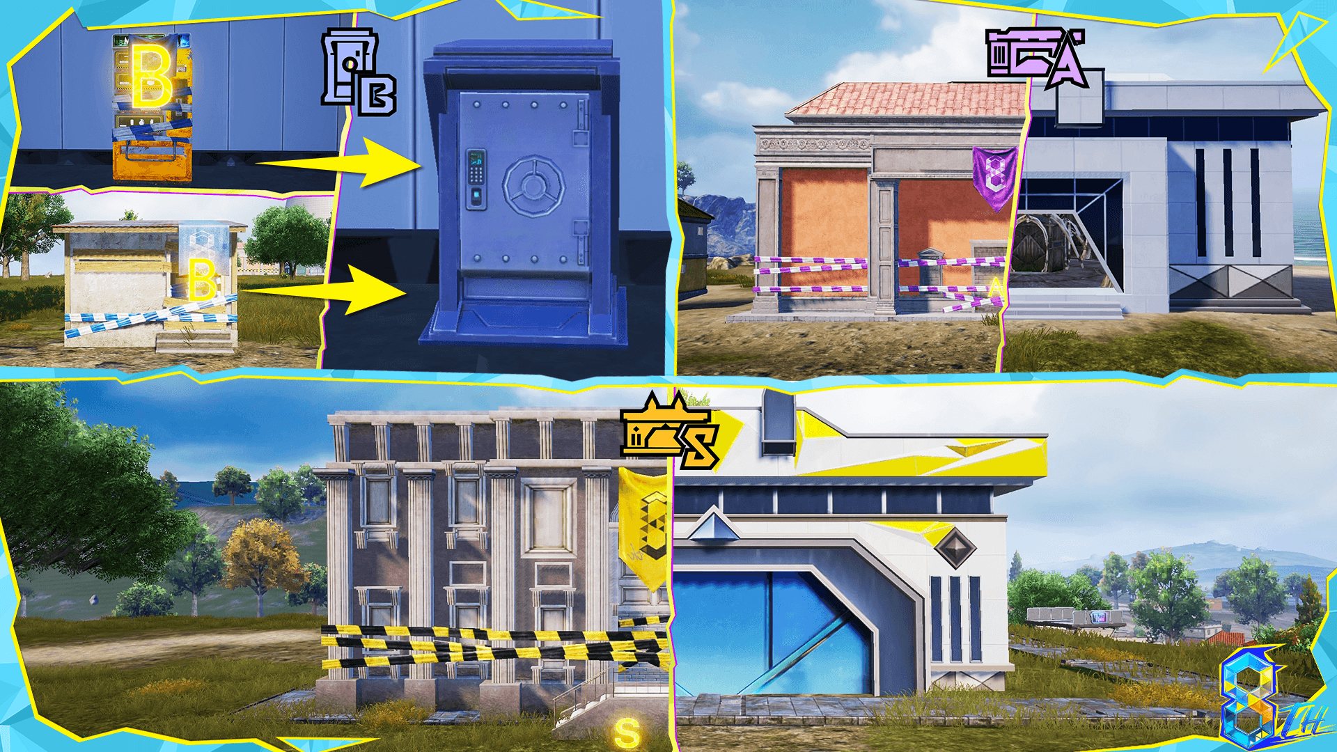 ●S-Rank Vault: Classic Erangel theme. Interact with the sandbox to predict the next Playzone location and change the weather in the area to rain. All exhibits in the vault can be interacted with to trigger special effects and obtain extra rewards. There is also an armory providing high-quality supplies.